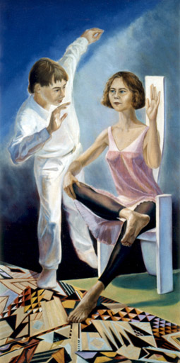 Eine moderne Version des Verkündigungs-Themas. Mari verhält sich dem Engel Gabriel gegenüber etwas abweisend, und der wildgemusterte Boden, auf dem beide stehen, symbolisiert Uneinigkeit. Maria trägt ein Gewand im antiken griechischen Stil.