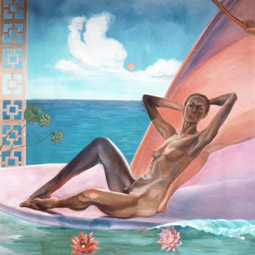 Lotusblüten sehen der Surferin zu, die mühelos auf den Wellen reitet. Die Ziegelsteine am linken Bildrand sind typisch für Gebäude auf Barbados und unterstreichen hier die unterschiedlichen Farben von Himmel und Meer.